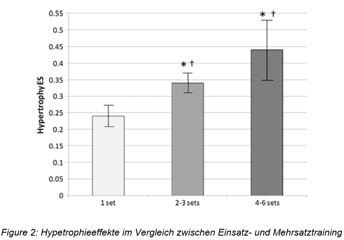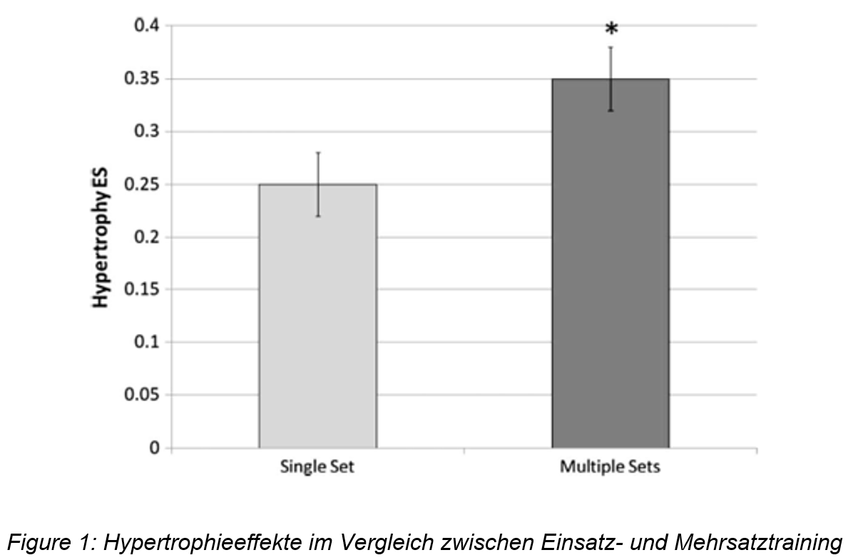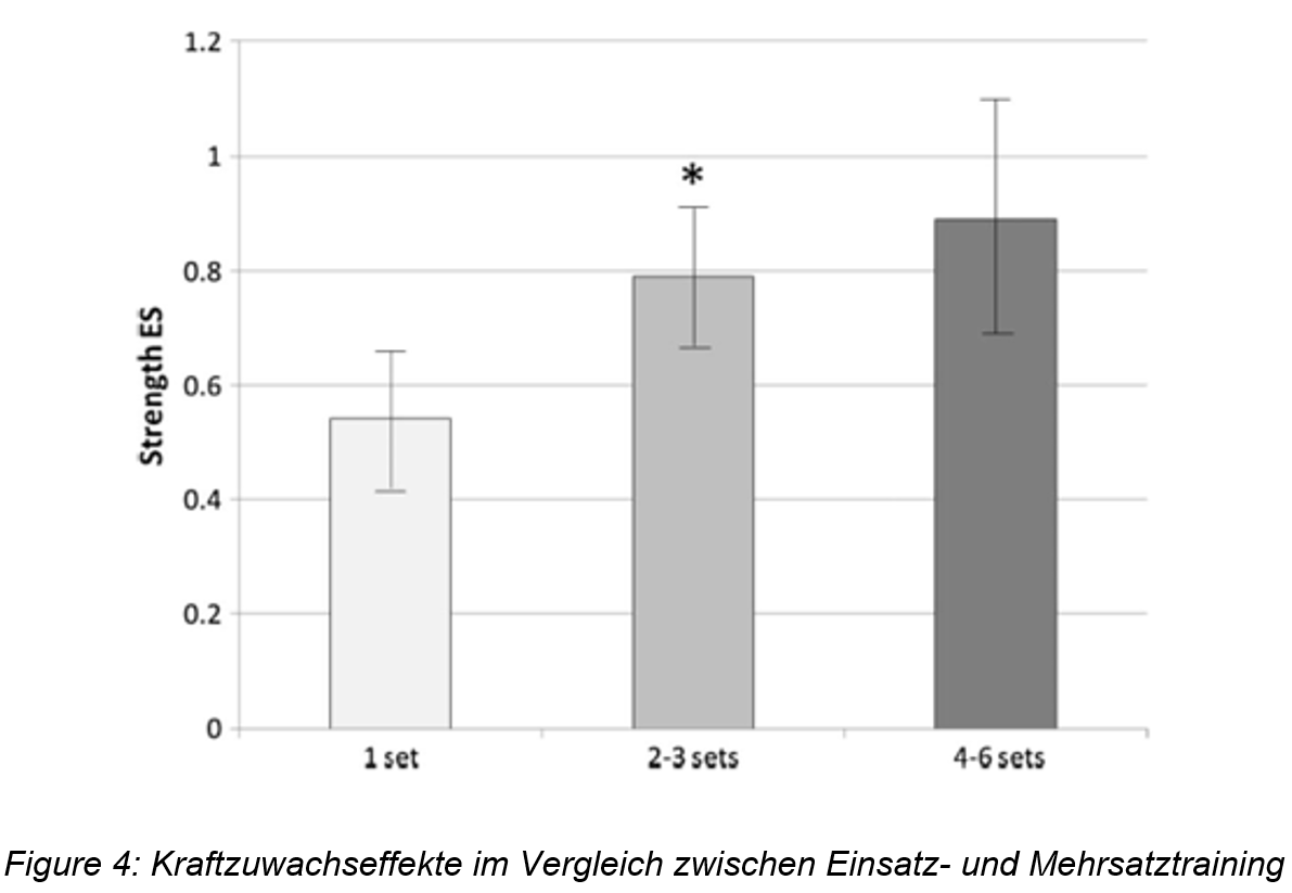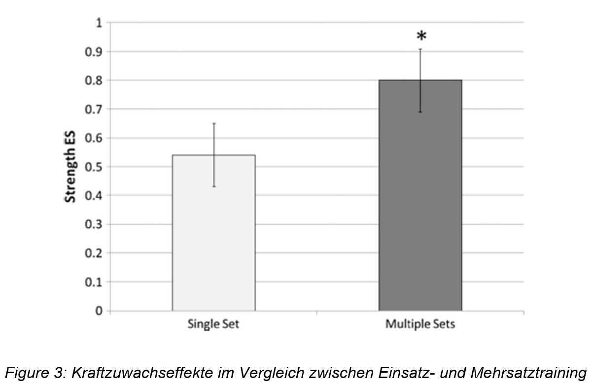 Krieger (2009) und Krieger (2010) hat jeweils eine Meta-Analyse betreffend Einsatz- vs. Mehrsatztraining und ihre Wirkung bezüglich Kraftzuwachs (Krieger, 2009) und Muskelquerschnittzunahme (Krieger, 2010) vorgenommen. Wie in Abb. 1-4 ersichtlich ist, zeigen Mehrsätzer im Vergleich zu Einsätzern klar bessere Ergebnisse auf. Dies in Bezug auf beide Parameter (Muskelfaserquerschnitt und Kraftzuwachs). Das Absolvieren von 2-3 Sätzen einer Kraftübung führten im Vergleich zum Einsätzer zu einem 46 % grösseren Kraftzuwachs (Krieger, 2009). Dabei wurde zudem beobachtet, dass 4-6 Sätze noch effektiver waren, als 2-3 Sätze. Dies jedoch nicht in demselben Verhältnis, wie der Vergleich von 2-3 Sätzen zum Einsätzer.