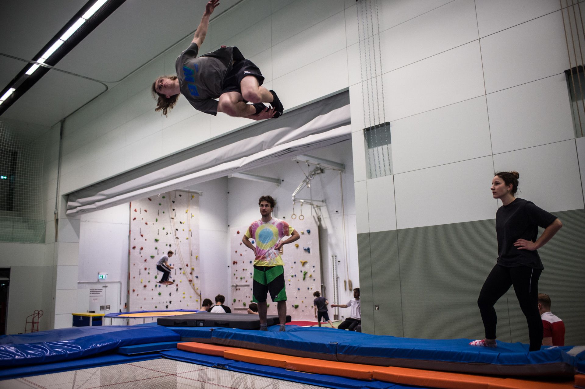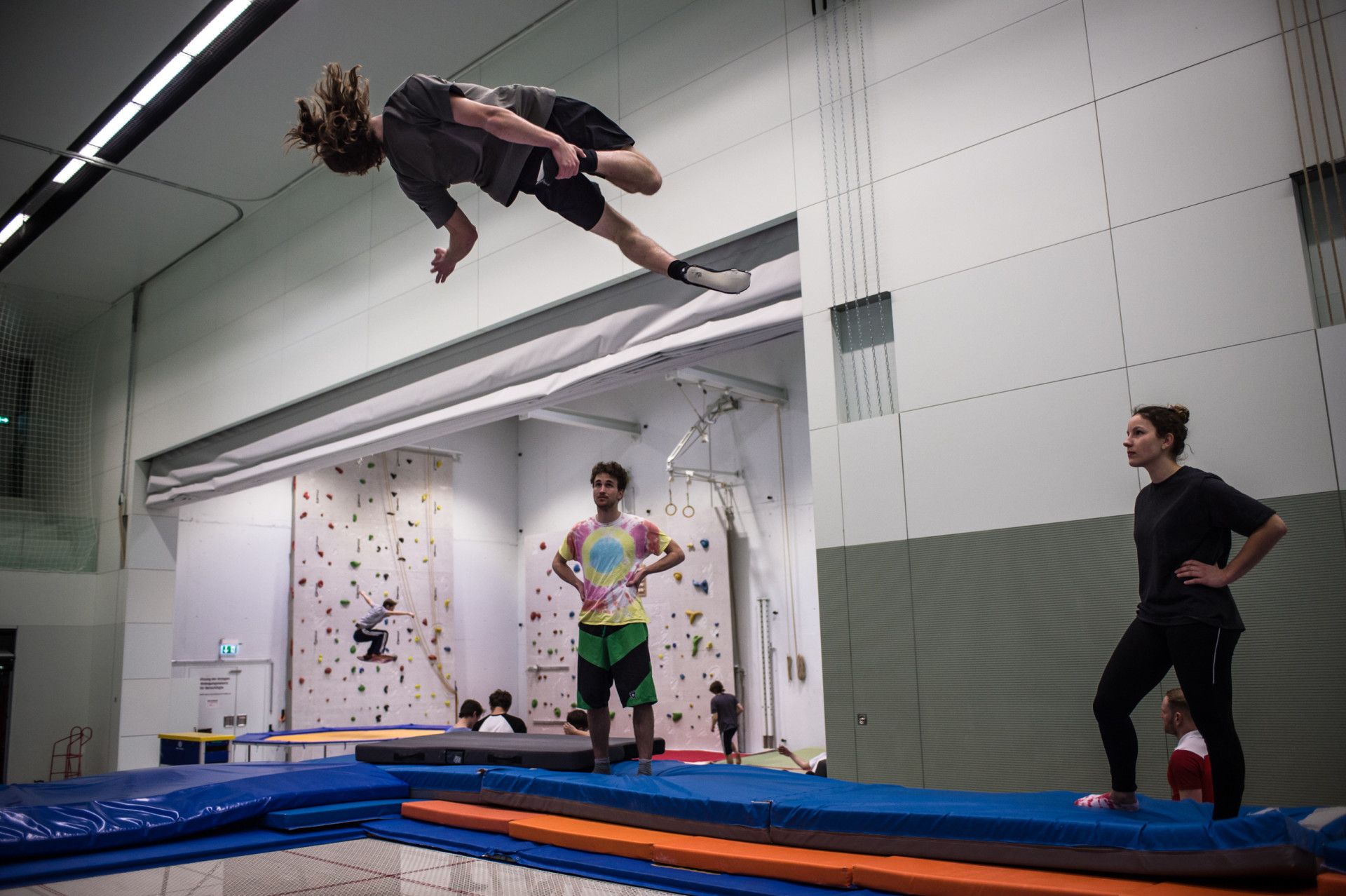 Neben BigAir-Training auf dem Eurotrampolin kannst du in diesem Training auch die Sportarten Slacklinen und Parkour ausprobieren, welche nebenan in der Halle 1 durchgeführt werden.